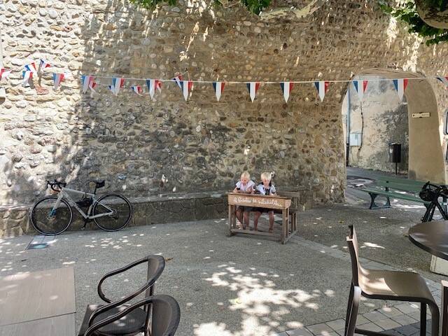 Een hele leuke plaats op de hoek aan het begin van de camping onder een prachtige boom. De temperatuur is aangenaam, 26 graden. Beetje bewolking en tussendoor een zon. Een magnifiek uitzicht vanaf onze plaats. Genieten! Kindjes duiken weer het zwembad in en Tim en ik beraden ons op de volgende stappen. Hugo heeft zelf een pizza gehaald en verder eten we parmaham met meloen (een vast item deze trip), rauwkost en een overheerlijk Frans hard worstje. Lekker!