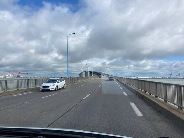 Heel leuk om de monding van de Loire te zien. Dat na al die jaren in Sancerre naast de Loire te hebben gezeten zien we nu eindelijk waar die het land in komt. De hoge brug is ook wel een bijzonder item op onze route.
